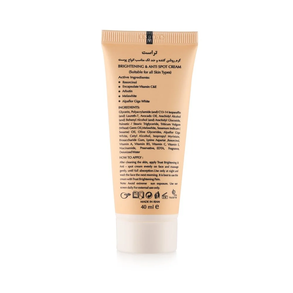 استفاده از ضد آفتاب برای محافظت از پوست جهت پیشگیری از بروز لکها امری مهم محسوب میشود. اما برای رفع لکهای پوستی، استفاده از کرمهای روشن کننده پوست گزینه مناسبی است. کرم تخصصی روشن کننده و ضد لک تراست دارای فرمولاسیونی تخصصی است و تحت لیسانس سوئیس تولید میشود. این کرم تخصصی یکی از بهترین انتخابهای ممکن برای رفع تیرگی و لکهای پوستی است. این محصول با برخوداری از ترکیبی بینظیر از مواد موثر روز دنیا مثل رزوسینول، آربیوتین، ویتامین E و C کپسوله و ملاوایت برای اولینبار در ایران تولید شد.