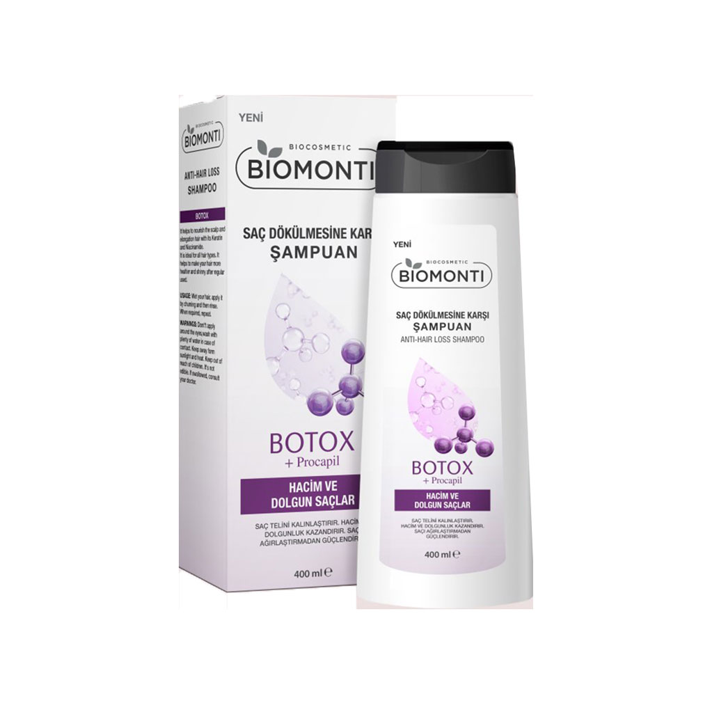 • شامپو ضد ریزش مو بیومونتی BIOMONTI حاوی بوتاکس و پروکپیل 400 میل، برای کنترل و توقف ریزش موها بهترین گزینه است.